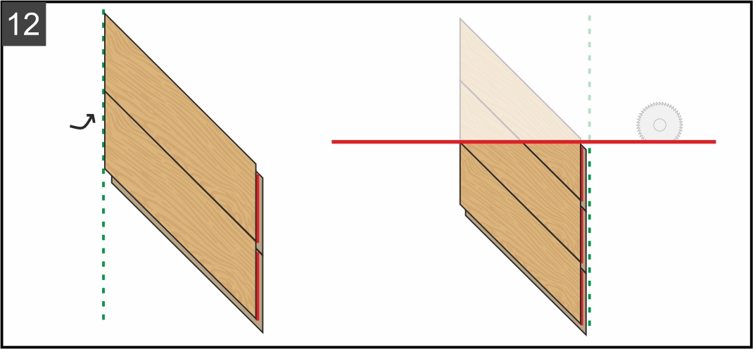 10.1. Начинайте сборку второго ряда, поочередно вставляя под углом плашки «В», следя за ровностью края аналогично первому ряду. Отрежьте край ряда по указанной на рисунке красной линии. В зависимости от типа пилы, которую вы используете, разберите плашки и отпилите каждую по отдельности или сделайте это уже в сборке, предварительно наметив линию при помощи угольника и карандаша.