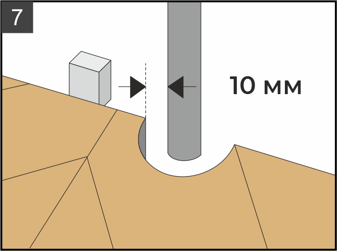 9.4. Соблюдайте ровность краев всего ряда. Укладывайте плашки с учетом зазоров 10 мм от всех стен и иных неподвижных сквозных конструкций (труб, дверных ограничителей, внутрипольных конвекторов и др.). Для расширения используйте монтажные (распорные) клинья (рис.7).