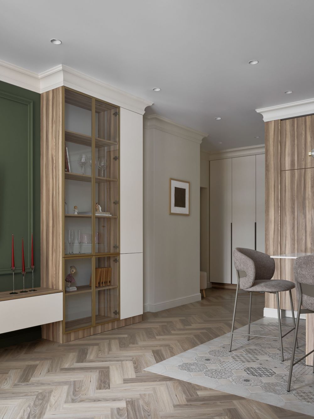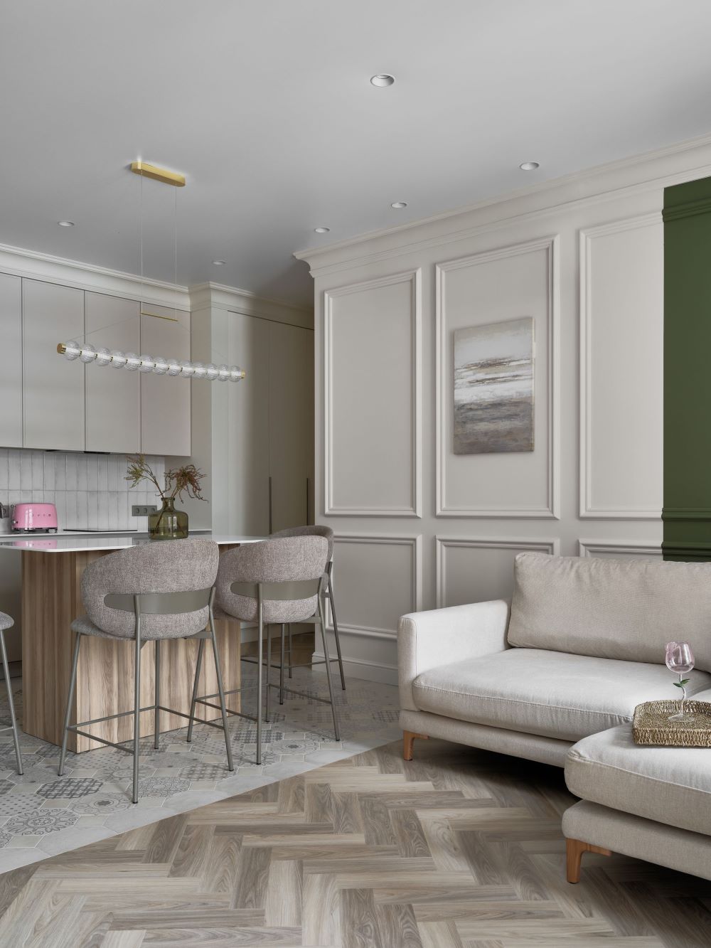 Классика этого интерьера читается в деталях — филёнках на стенах, широких карнизах и спокойной симметрии. Пространство звучит современно и легко, как продуманная композиция без лишних нот. Акцентная стена в цвете хаки добавляет интерьеру глубину и гармонично объединяется с тёплым деревом в отделке.